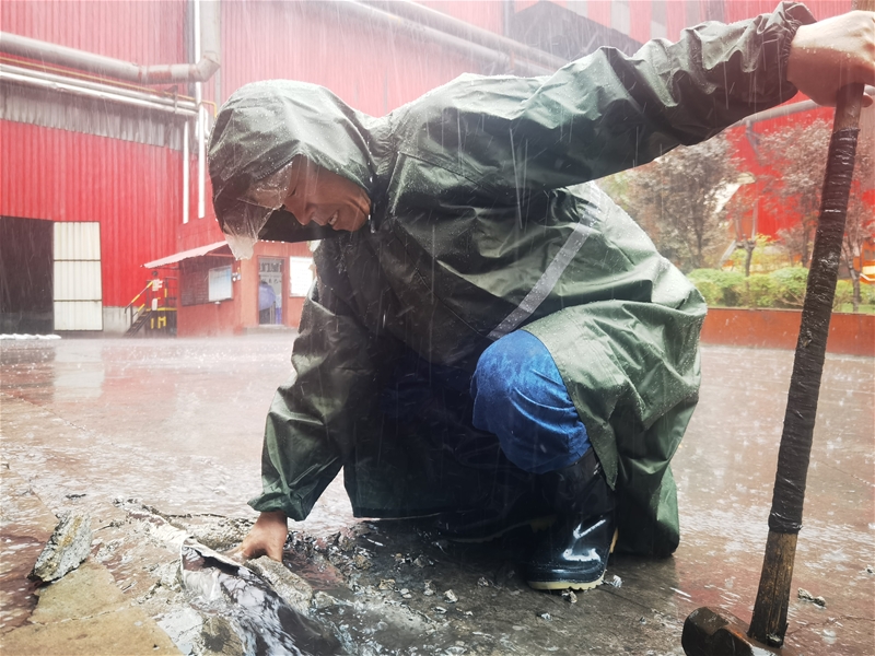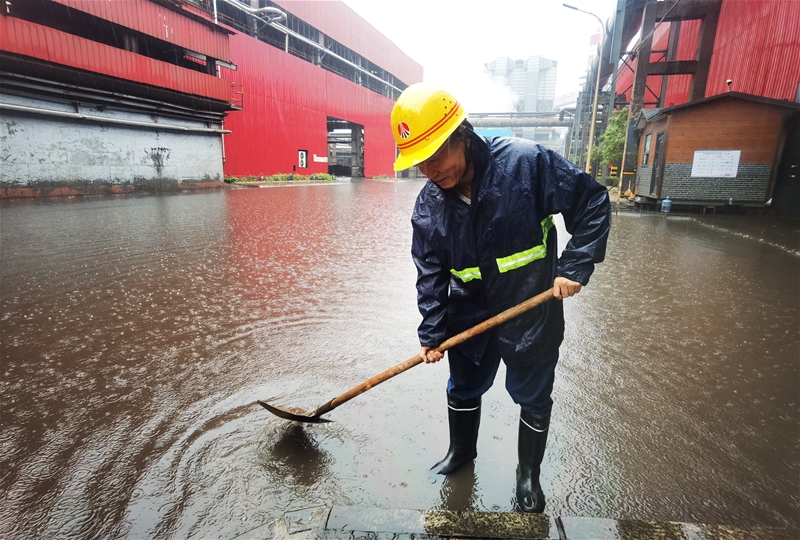 在煉鋼南路廢鋼跨各門口,一場(chǎng)與風(fēng)雨的較量也在持續(xù)上演。暴雨如注,也最考驗(yàn)責(zé)任擔(dān)當(dāng),只要是急難險(xiǎn)重,他們都挺身而出。由于受風(fēng)的影響,廠房雨檐流下的雨水有倒灌入廠房的趨勢(shì)。“快,跟我來,我們將跨口的水路再疏通一下。”在安全員薛云峰的號(hào)召下,大家毫不猶豫,沖了過去。他們團(tuán)結(jié)一心、毫不退縮,挖的挖,鏟的鏟,掏的掏……很快將水路疏通徹底,使廢鋼廠房?jī)?nèi)處于安全狀態(tài)。在戰(zhàn)斗過程中,由于雨水深淹,不少隊(duì)員一路趟著沒過腳面的積水,行來往去、毫不理會(huì)……雖然風(fēng)雨無常,但是他們心懷全局、意志堅(jiān)定,不達(dá)目標(biāo)不罷休。風(fēng)雨之中,他們是戰(zhàn)斗到底的“真王者”。