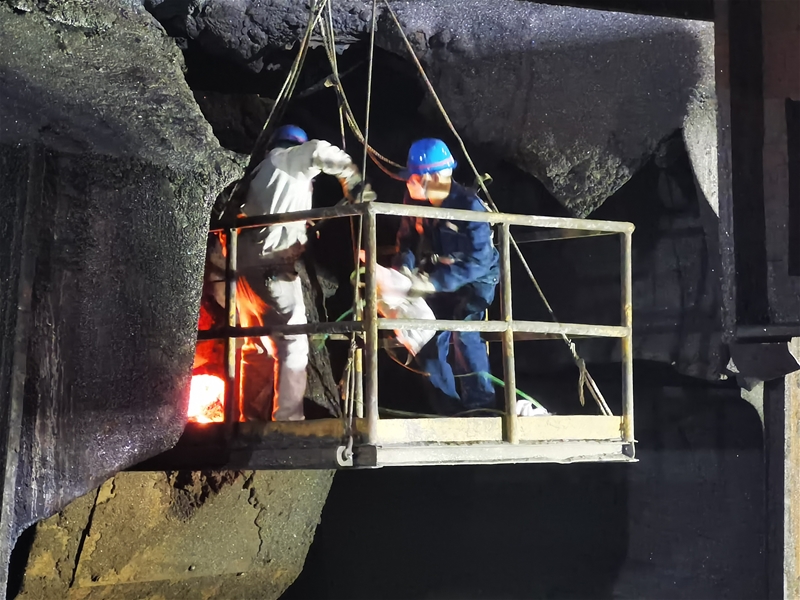 此次檢修時(shí)間緊、任務(wù)重,為了高質(zhì)量完成檢修任務(wù),該單位黨員干部瞄準(zhǔn)目標(biāo)、通力協(xié)作,“釘”在檢修現(xiàn)場。恰逢高溫時(shí)節(jié),檢修現(xiàn)場酷熱異常,從爐口散發(fā)出來的熱浪令人望而生畏。而所有參與檢修的斗士們毫不畏懼,他們身著白色阻燃服、腳踩專用耐高溫鞋,全副武裝,冒著炙烤進(jìn)行“清爐襯”作業(yè)。由于爐內(nèi)空間狹窄,加之溫度高,清爐襯過程異常艱難。他們分為兩組,輪換作業(yè),保證進(jìn)度絲毫不減。汗水浸濕了工服,汗珠往下滴個(gè)不停,而檢修隊(duì)員毫不理會(huì),他們拼著勁往前沖……在他們的全力拼搏下,原本計(jì)劃一天拆完?duì)t襯,他們只用了半天就完成了,這就是煉鋼速度。