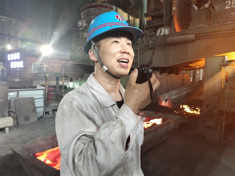 圖一:煉鋼廠連一作業(yè)區(qū)3#連鑄機丙班班長王昆正在指揮天車進行吊運作業(yè),盡管背后有炙熱的紅渣,但為了站在指揮天車的最佳位置,他紋絲不動。掛滿汗水的笑臉考驗著這位鋼鐵男兒的執(zhí)著與夢想。
