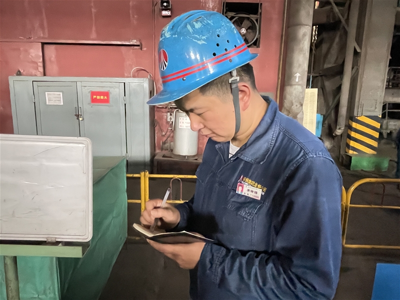 圖九:煉鋼廠天車作業(yè)區(qū)天車工李鋒博在記錄設備運行情況,他所在的出坯垮地面全是1000℃的紅坯,熱量持續(xù)往上方擴散,臉上的汗珠往下滑落,不變的是他對設備的認真負責。