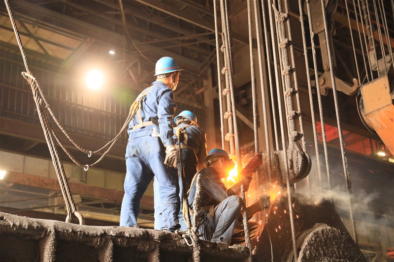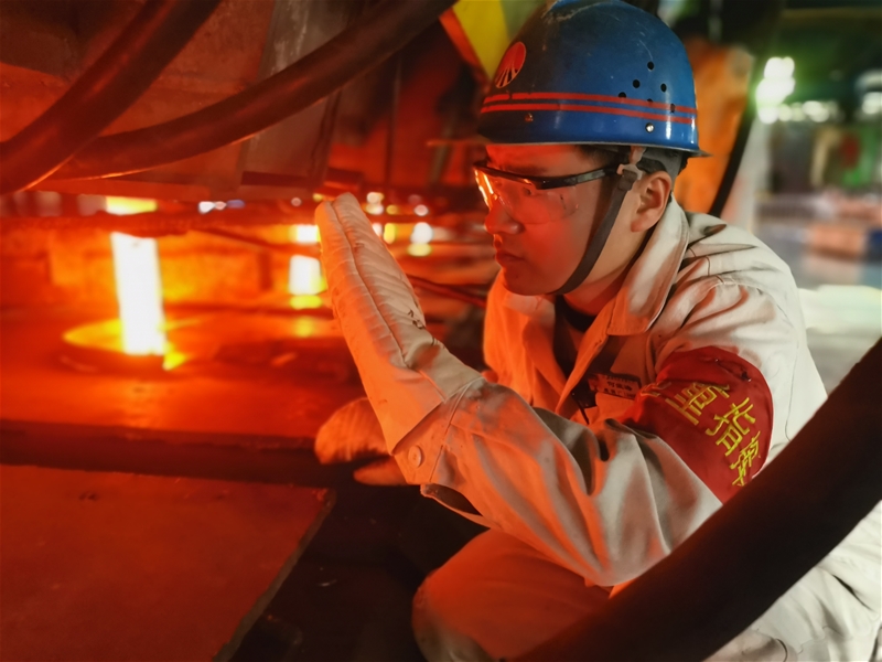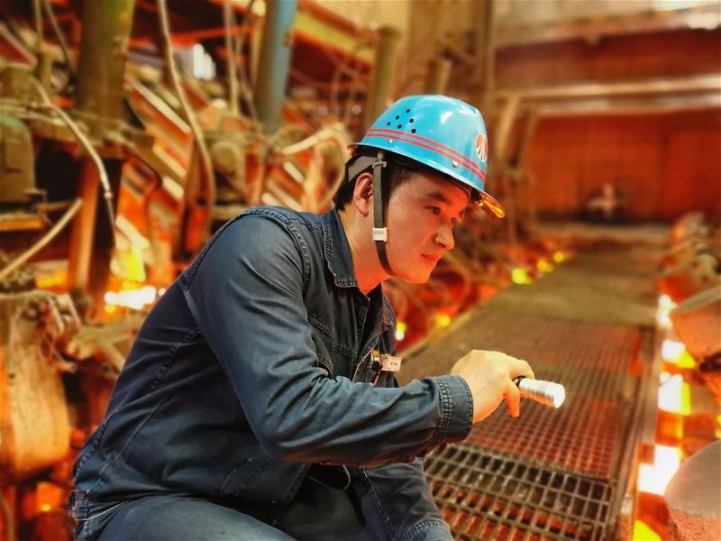 圖八:煉鋼廠連二作業(yè)區(qū)6#連鑄機中包工何武濤正在對在線水口、機件進行檢查。面對眼前1500℃的鋼水,他眼戴護目鏡,身穿阻燃服,在汗流浹背中守護著安全生產。