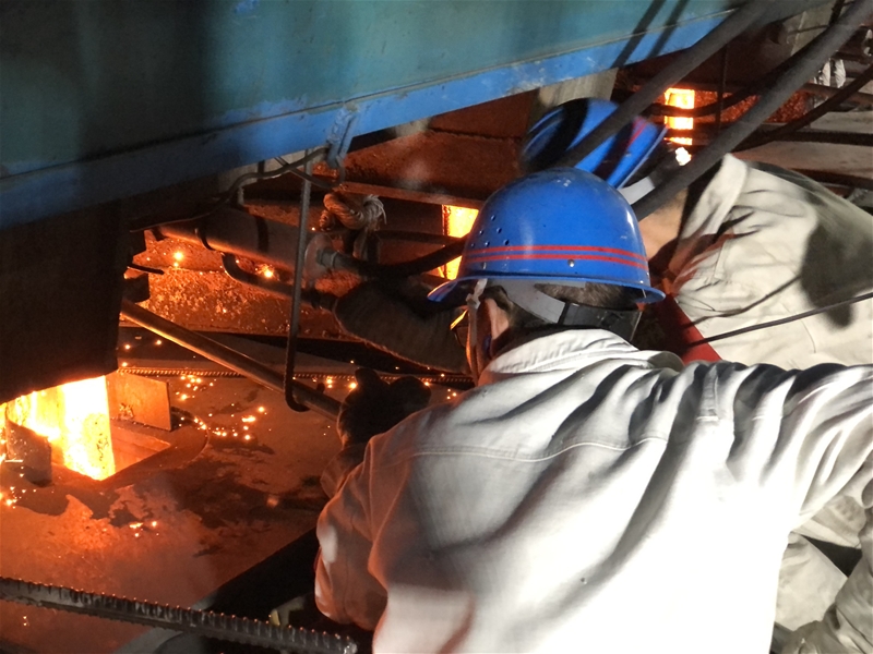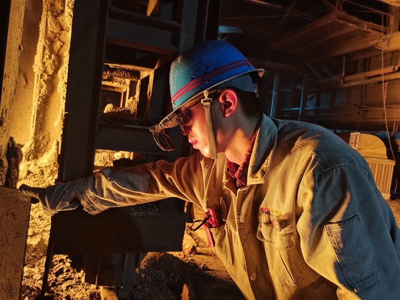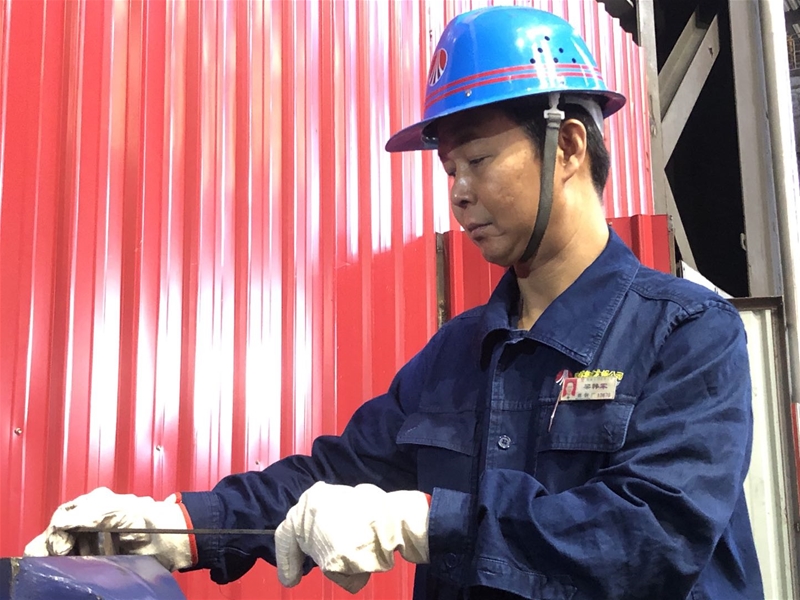 圖二:煉鋼廠連二作業(yè)區(qū)安檢員郭云峰正在對拉矯系統(tǒng)進行檢查,火紅的鋼坯從他的腳邊緩緩穿過,盡管他全身被烤得微疼,但他的眼睛始終聚焦在運轉的設備上,不敢有一絲懈怠。
