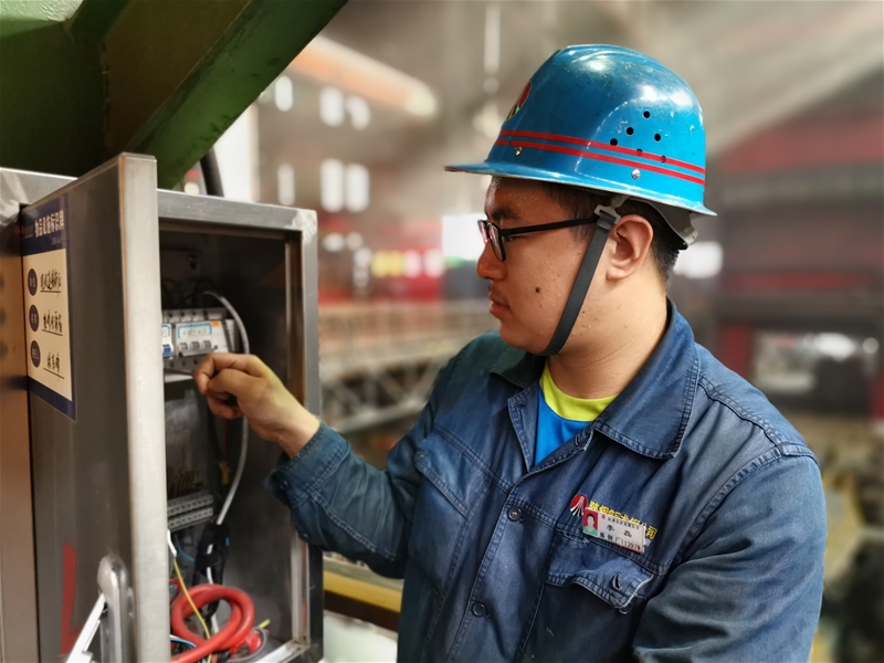 圖四:煉鋼廠轉爐平臺上電儀作業(yè)區(qū)電工李磊正在對配電柜線路進行檢查,滾滾熱浪撲面而來,他身上的汗腺像被擰開了的開關,瞬間汗如泉涌。