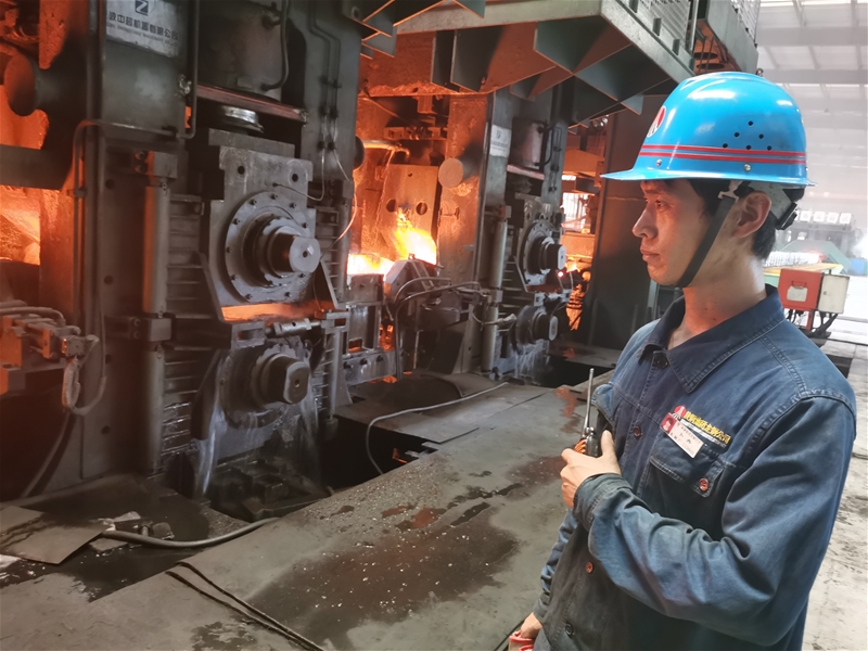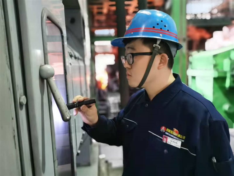 緊張有序地換輥作業(yè)結(jié)束后,卜丹一邊擦拭汗水一邊喝水,眼睛還時不時盯著軋機的方向,他一口氣喝完杯中的涼開水,走進值班室接滿一杯,放下杯子,拿上對講機,迅速來到軋機旁,聚精會神地對軋制質(zhì)量、設(shè)備等情況進行觀察,只見他時而彎腰用手電查看設(shè)備運轉(zhuǎn)情況,時而站立在軋機旁仔細觀察著軋制板型,手中緊握著對講機,以便及時向操作臺反饋信息。在“蒸籠般”的環(huán)境中,即使毛巾都擦拭黃了,衣服能擰出水來,卜丹仍舊穿梭在軋機之間,只為確保產(chǎn)品質(zhì)量和生產(chǎn)順行。