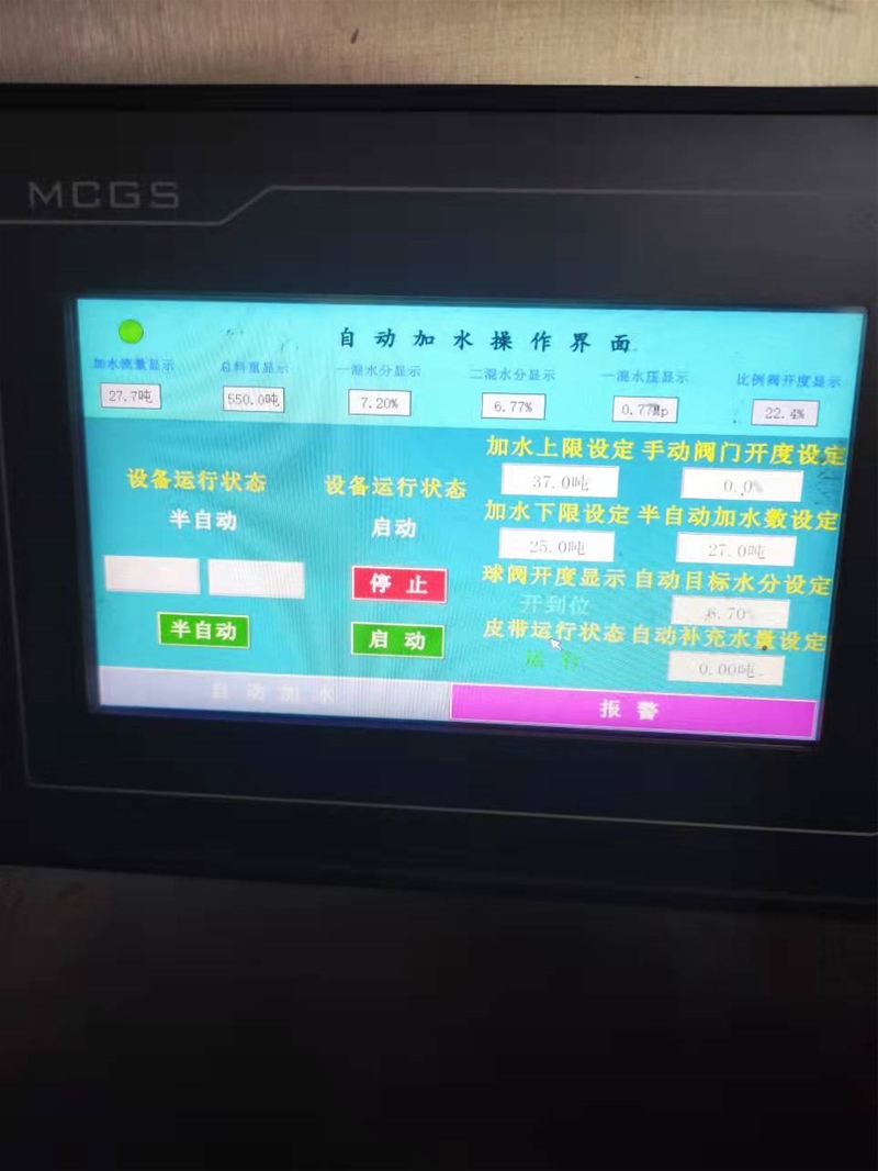 燒結混勻礦水分配加穩(wěn)定與否直接影響著燒結礦質量,原有水分測定儀因受外界環(huán)境和物料流量變化影響,響應慢、精度低,不能滿足水分測定及配加要求。此次采用的接觸式水分分析儀分別安裝在一混、二混后輸送帶上,其特點為接觸式、不間斷、防蒸汽、防粉塵、實時在線,不受光照、溫度、濕度、物料高度及形狀影響,可以在全自動、半自動和手動運行模式下無縫銜接、無中斷切換。該項目根據工藝控制優(yōu)先的原則,自動控制加水量,當物料流量發(fā)生大的變化時,系統可及時作出響應,在60秒之內重新達到穩(wěn)定,使最終的水分值達到目標值,并將水分值穩(wěn)定在系統精度范圍內。